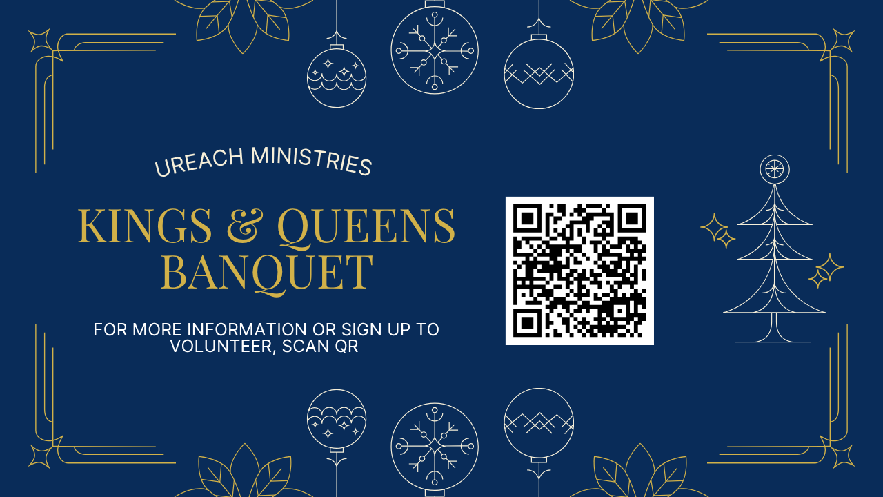 UReach will be hosting a Kings & Queens Banquet geared towards our unhoused brothers and sisters in the community. They will have a Christmas feast prepared, haircuts, showers, clothing, wound care, prayer stations, and more available. If you would like to volunteer, please click the button below. The event will take place, December 14 from 2:30 - 6:00 PM at Crosswalk Redlands Church.