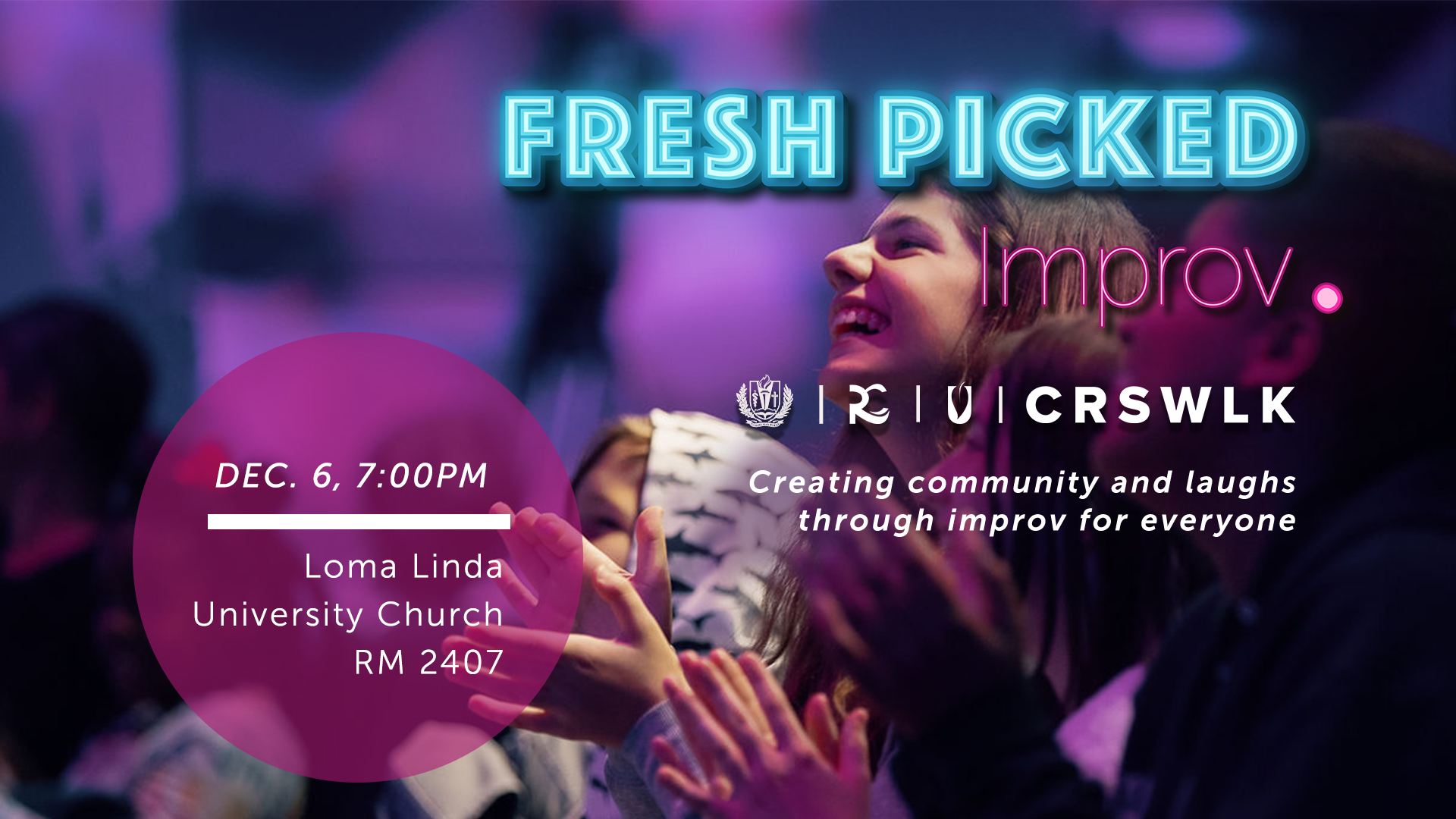 Come enjoy a night of improvised theater where performers create characters and stories on the fly inspired by audience suggestions. It's the show where everything is made up and your suggestions matter! Invite a friend to a night of community and laughs for all ages. The next Fresh Picked Improv show is 7 p.m., Saturday, December 6 at the Loma Linda University Church youth room (room 2407).