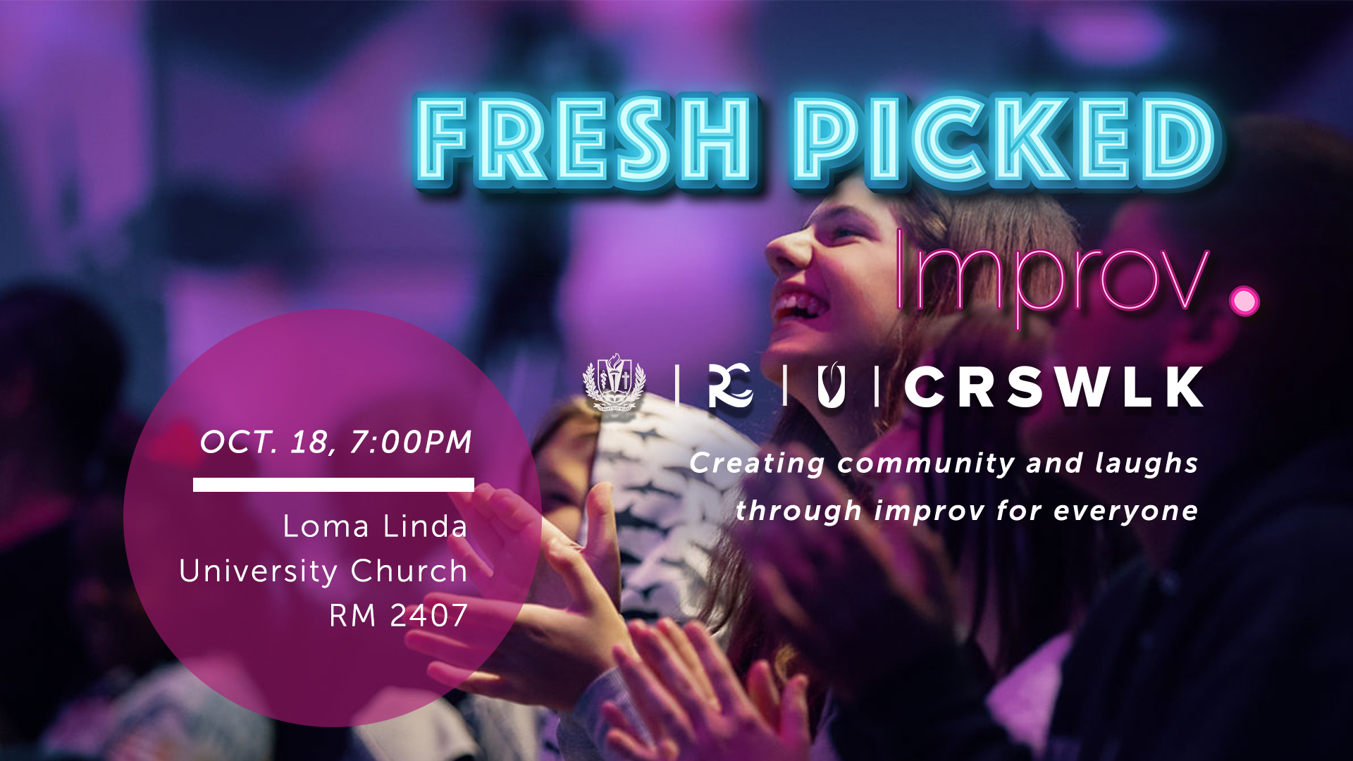 Enjoy a night of fun for all ages where actors create characters and stories on the spot inspired by audience suggestions. The next Fresh Picked Improv show is 7pm, Saturday, October 18 at the Loma Linda University Church youth room (room 2407).
